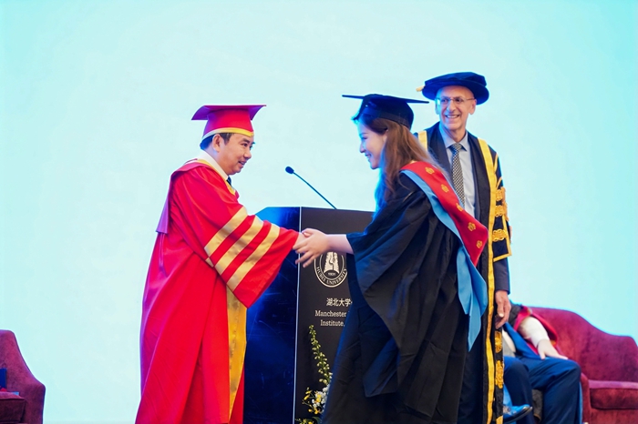 毕业典礼参照曼彻斯特城市大学学位授予流程,刘建平身着中式导师服,Malcolm Press身着曼城大导师服,毕业生身着曼城大学士学位服,依次上台与两位董事长握手并合影。